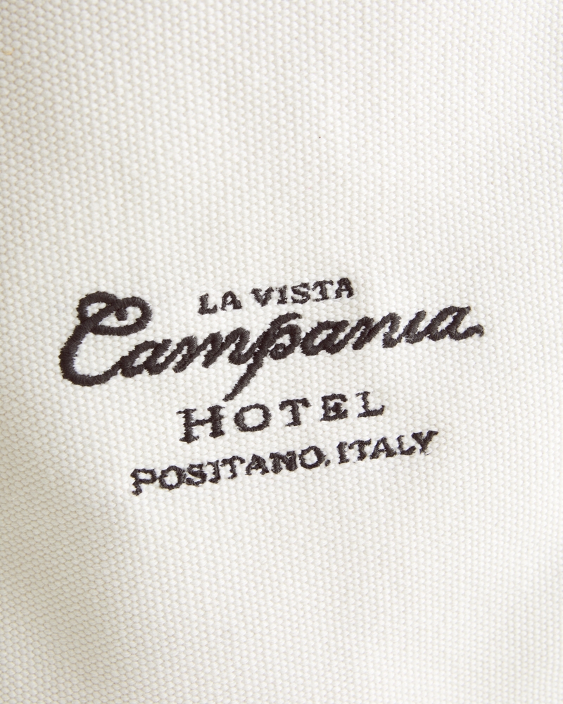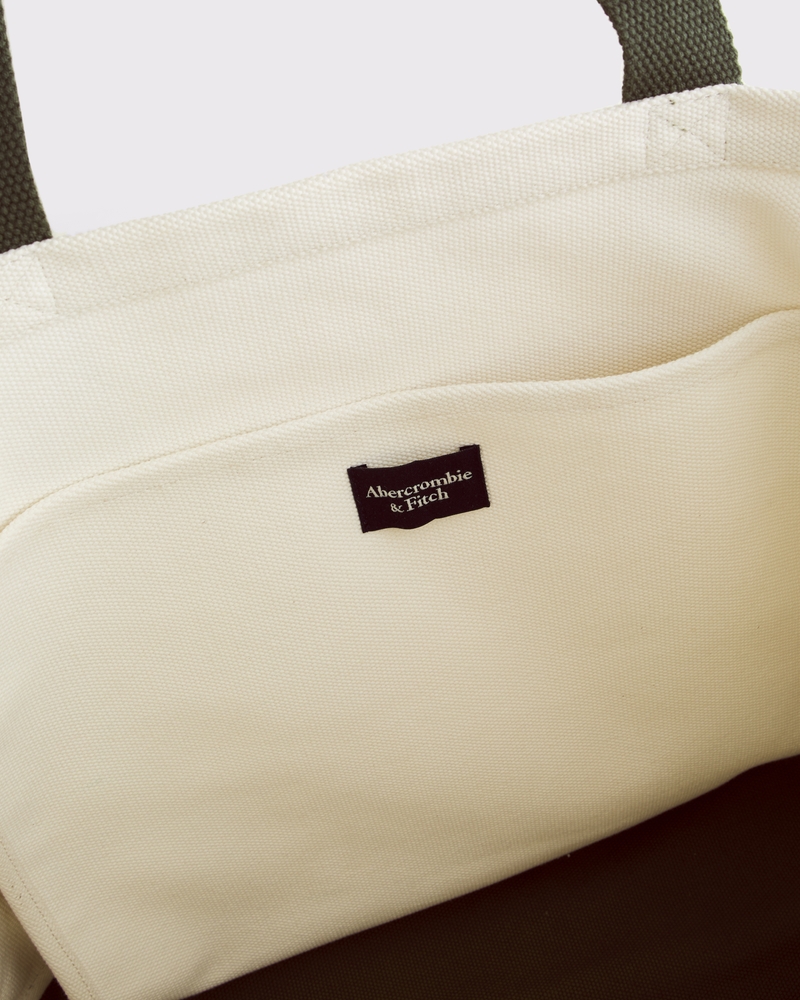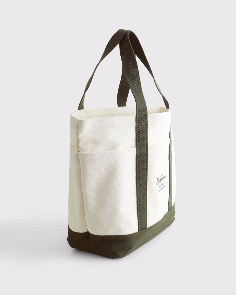 Our new tote bag in a soft canvas fabric, with on-trend graphic detail, over the shoulder straps, 6 exterior pockets and one large interior pocket with a smaller interior sleeve in the back. Height: 15 in. Width: 5.5 in. Length: 18 in. Imported.
