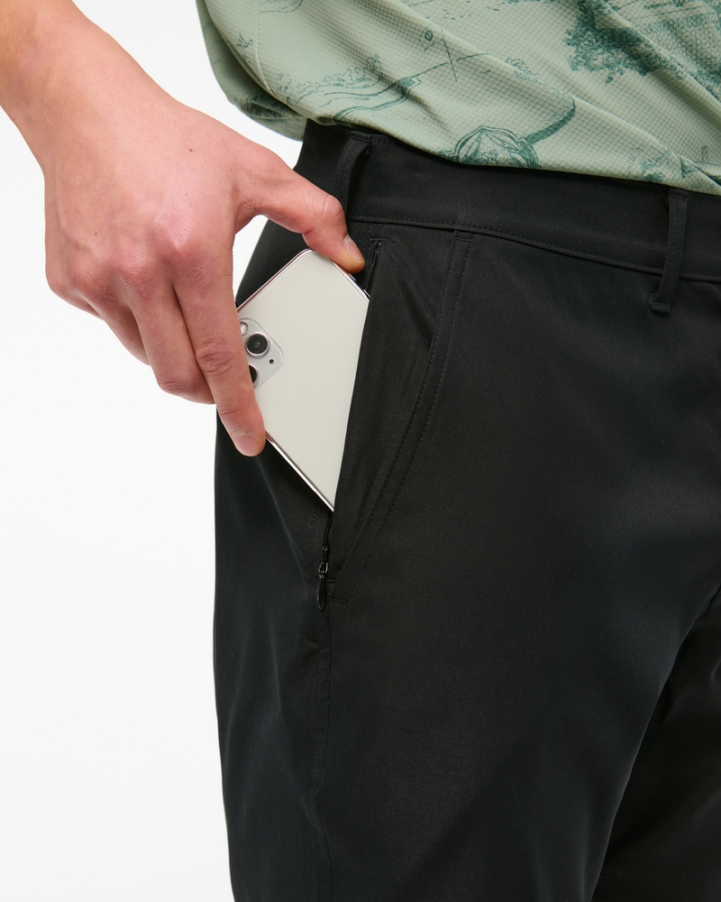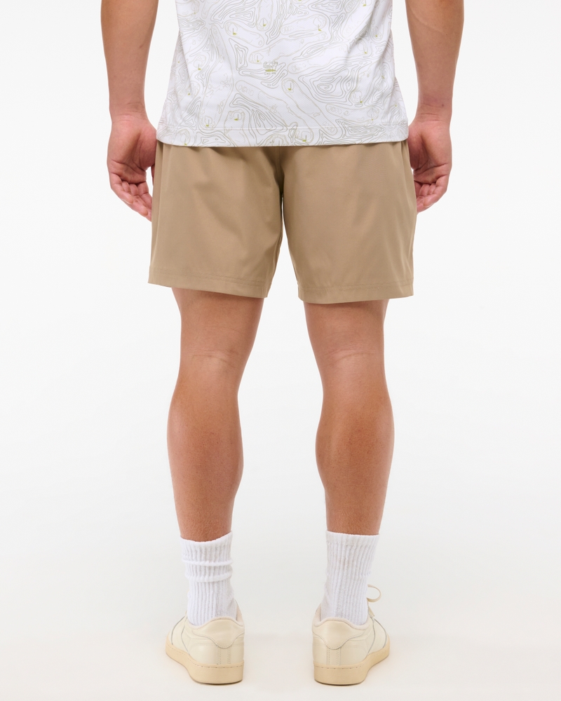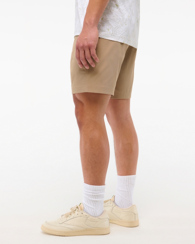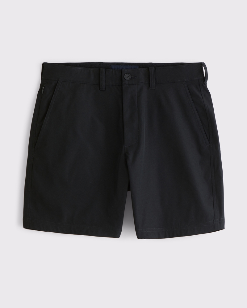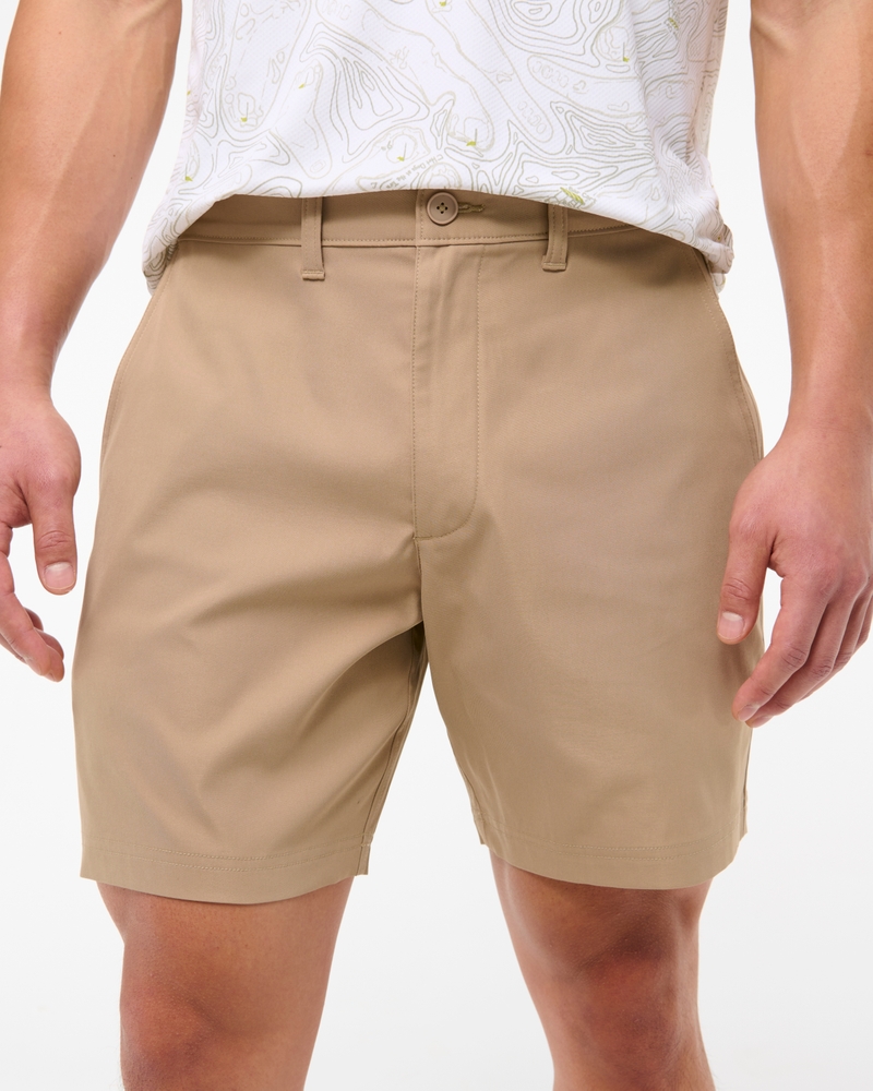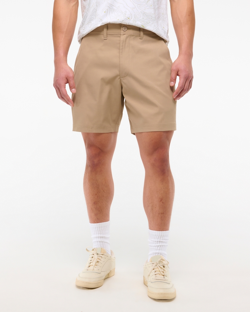 Our new 7 inch (18 cm) plainfront shorts in a stretchy, breathable fabric. Features quick-dry and wrinkle-release properties, pockets throughout, belt loops and button fly closure. Imported.