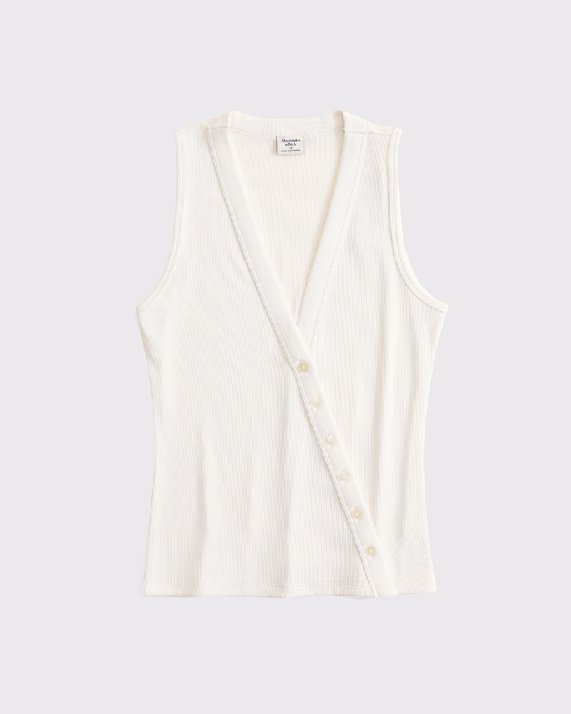 Slim-fitting top in our powdered rib fabric, featuring on-trend v-neckline, asymmetrical button-through detail and all-over ribbed detail. Imported.