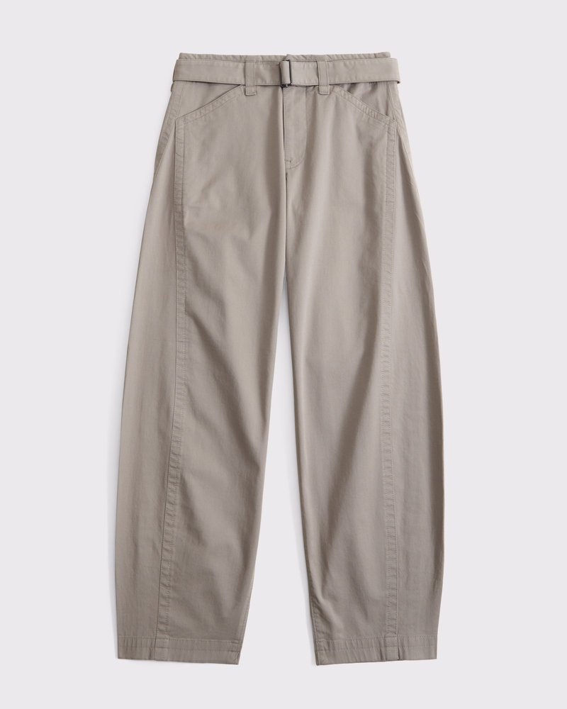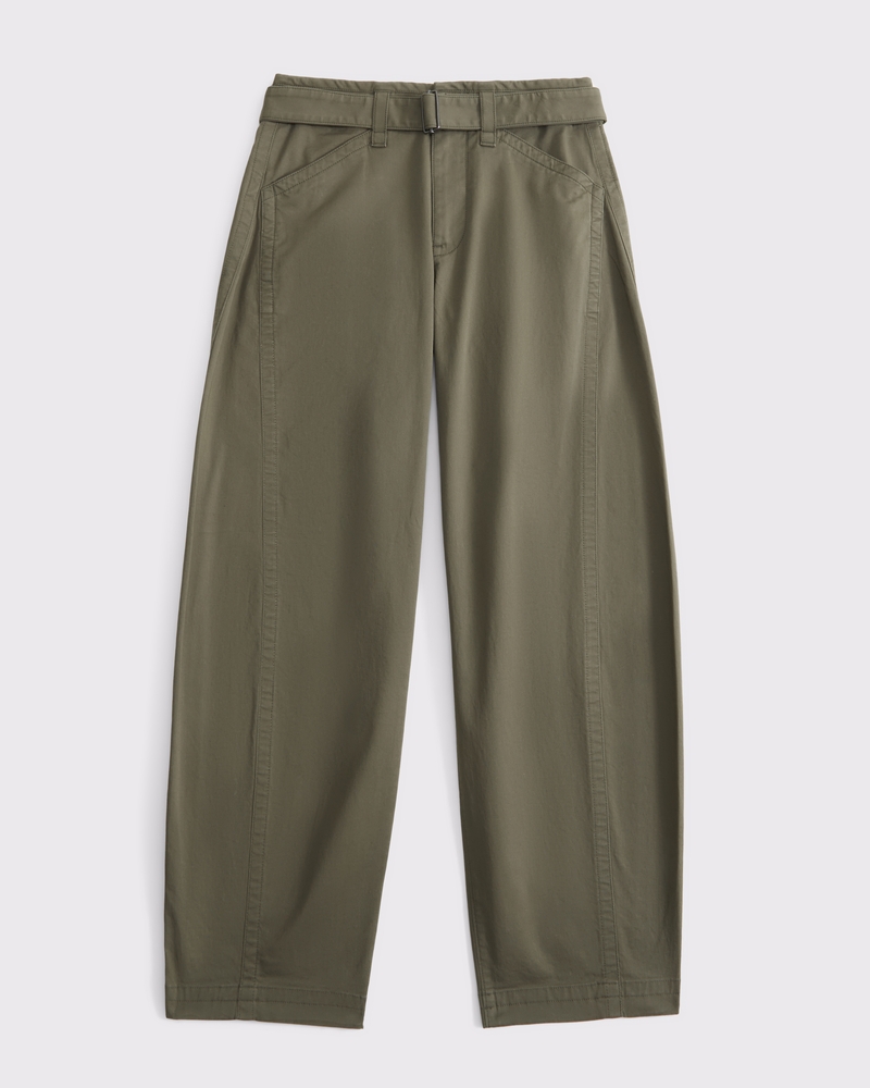 Mid rise pants, that have a relaxed fit at the waist and hips, loose fit through the thigh and calf and tapers into a barrel-leg shape. Features functional pockets, waistband closure and a removable belt. Imported.