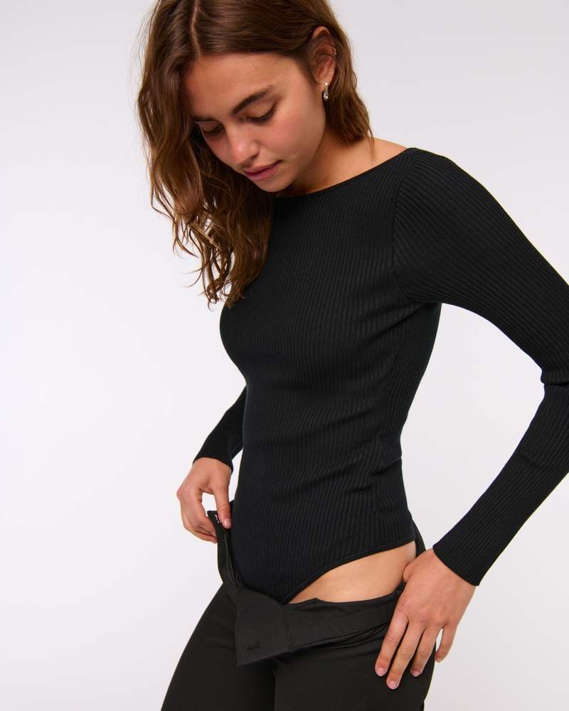 Slim-fitting bodysuit in our sculpting sweater-knit fabric, featuring an open-back detail with tie closure, shelf bra with removable pads, ribbed stitching details throughout and two-snap bottom closure. Pairs perfect with your favorite mini skirt for a night out!
