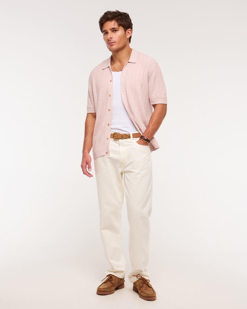 Comfortable sweater polo in a soft sweater-knit fabric and relaxed-fit silhouette, featuring button-through detail, classic polo collar, vertical cable stitching details throughout and banded hem and cuffs. Imported.