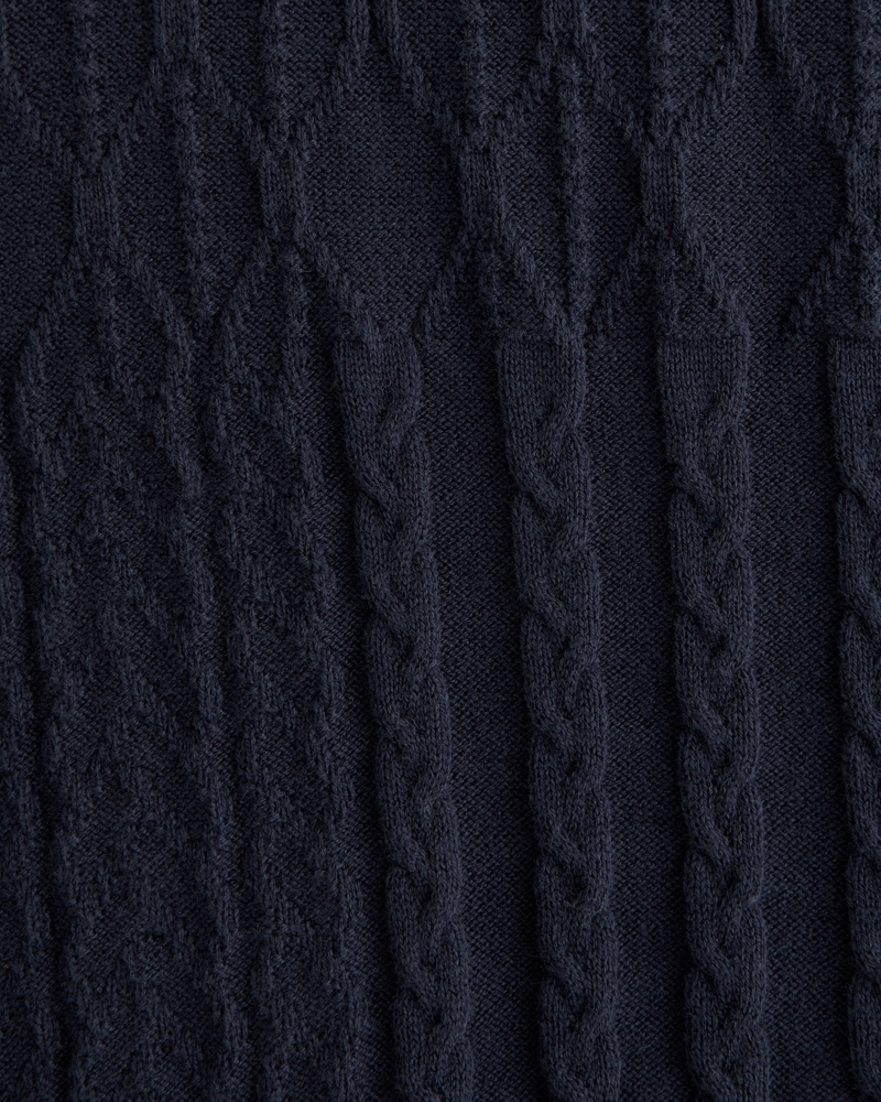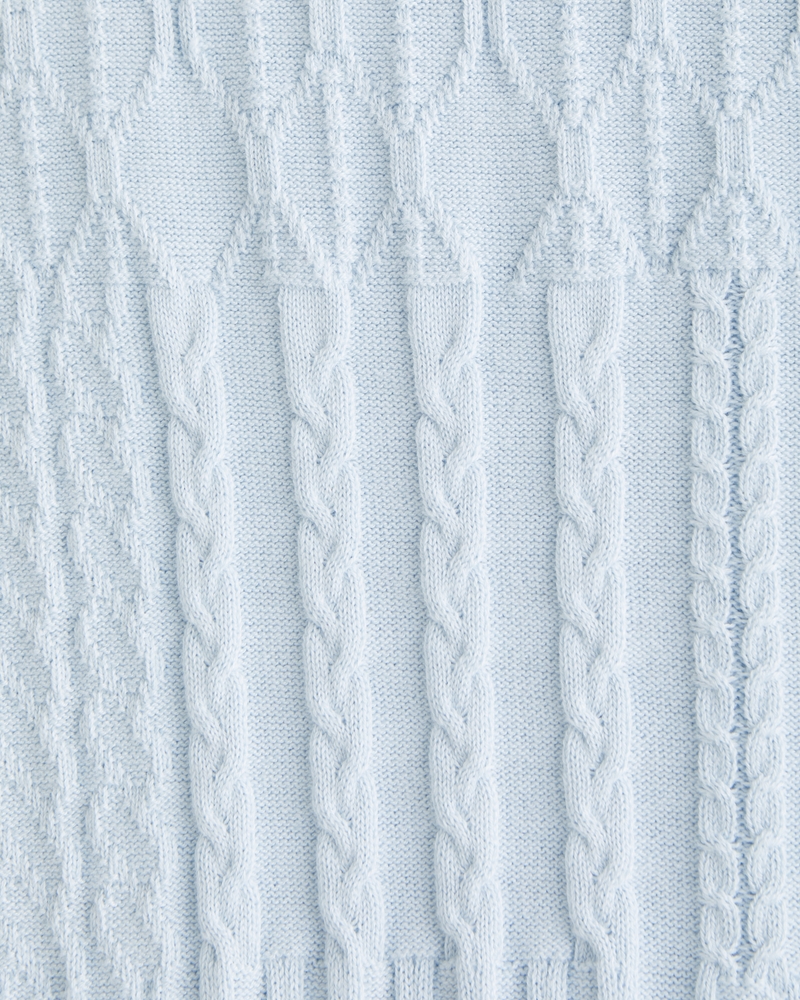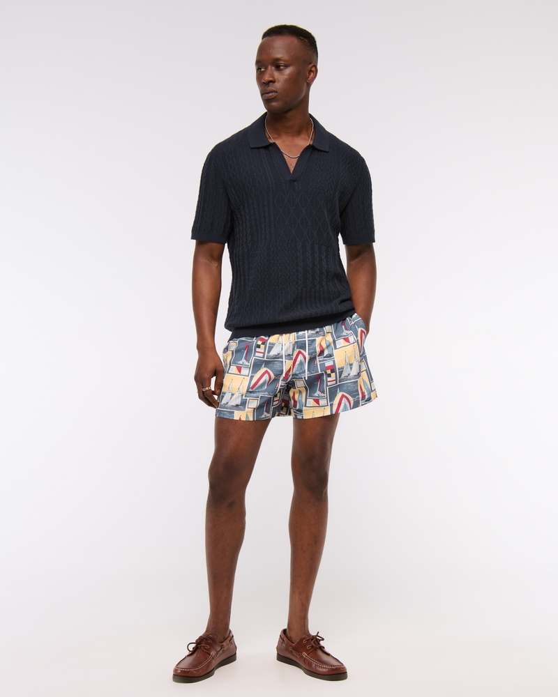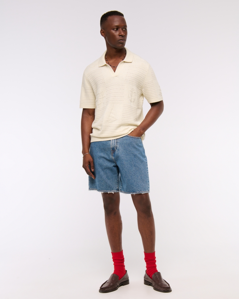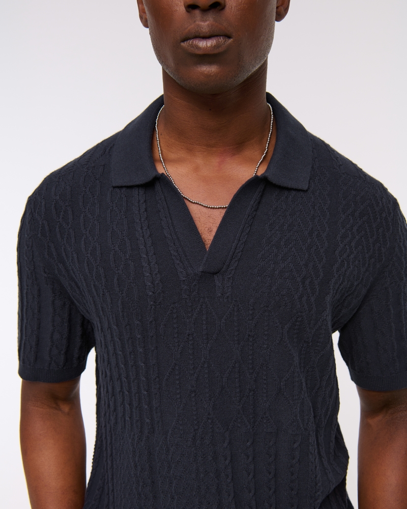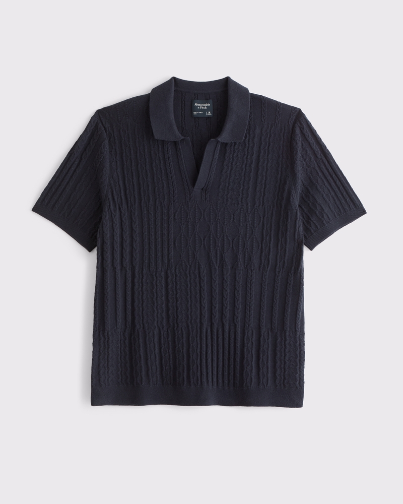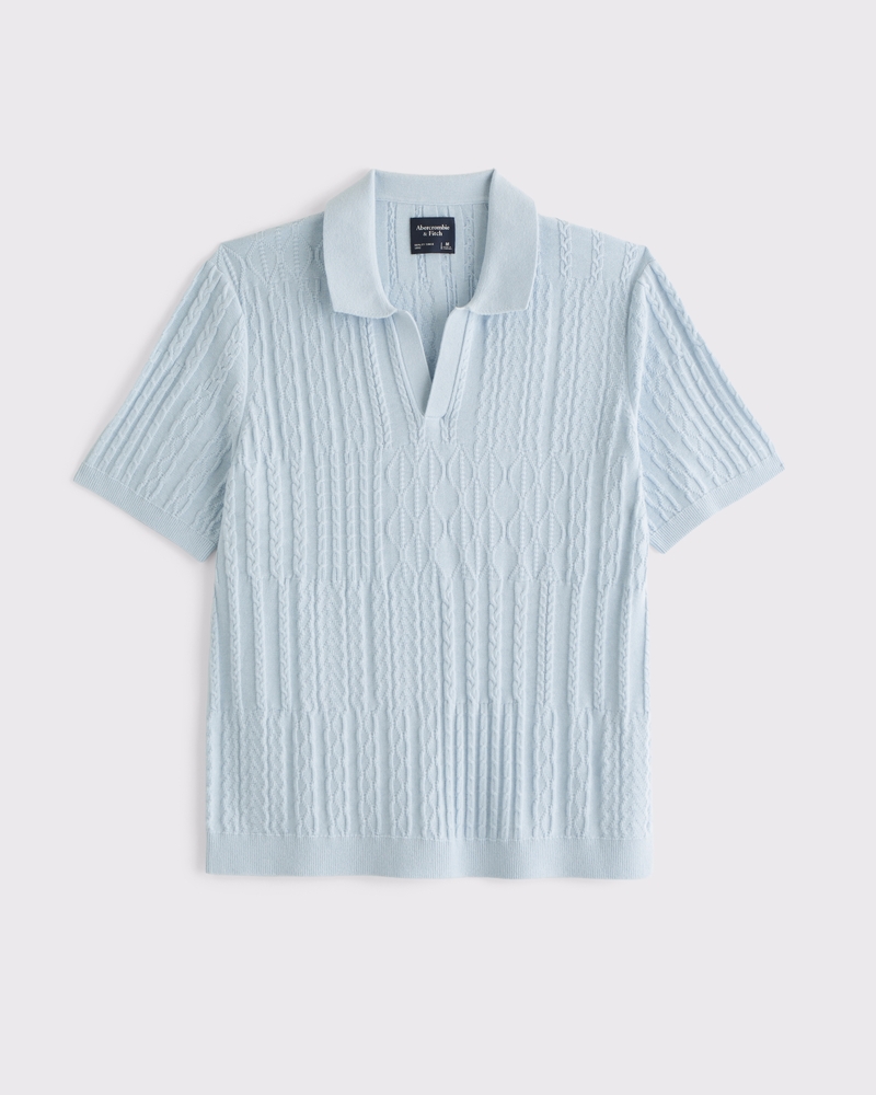 Short-sleeve sweater polo in our soft sweater-knit fabric and relaxed-fit silhouette, featuring cable patchwork stitching details throughout, no-button Johnny collar and banded hem and cuffs. Imported.
