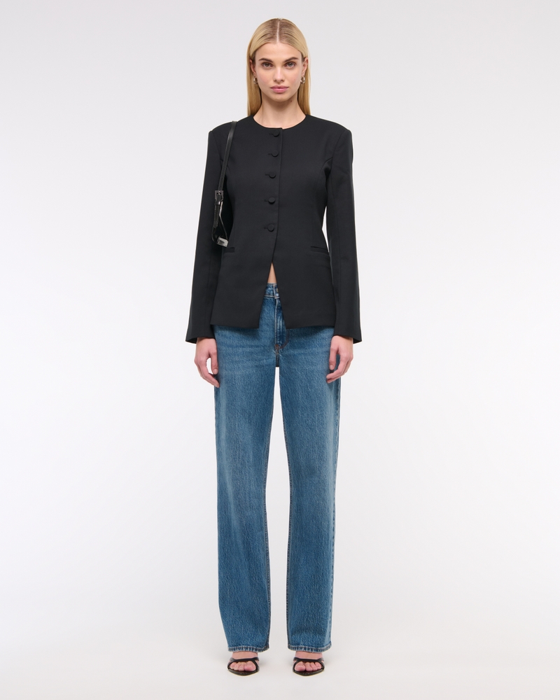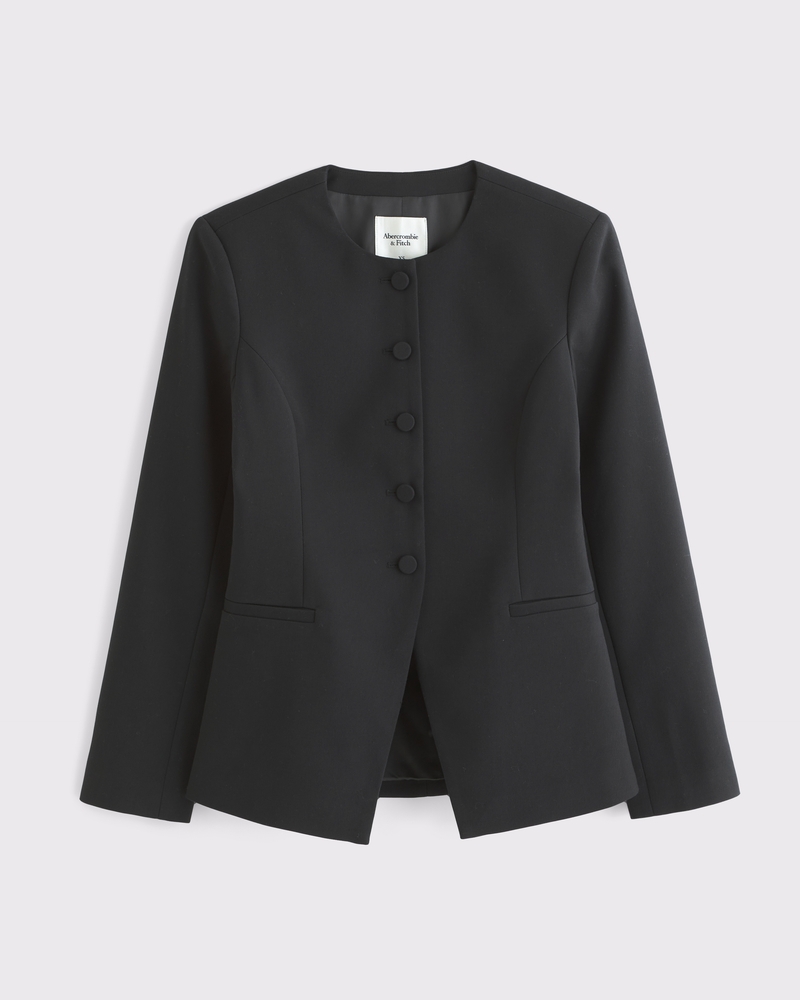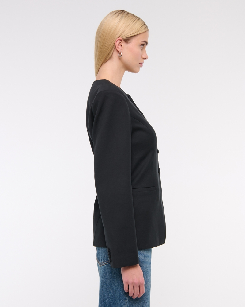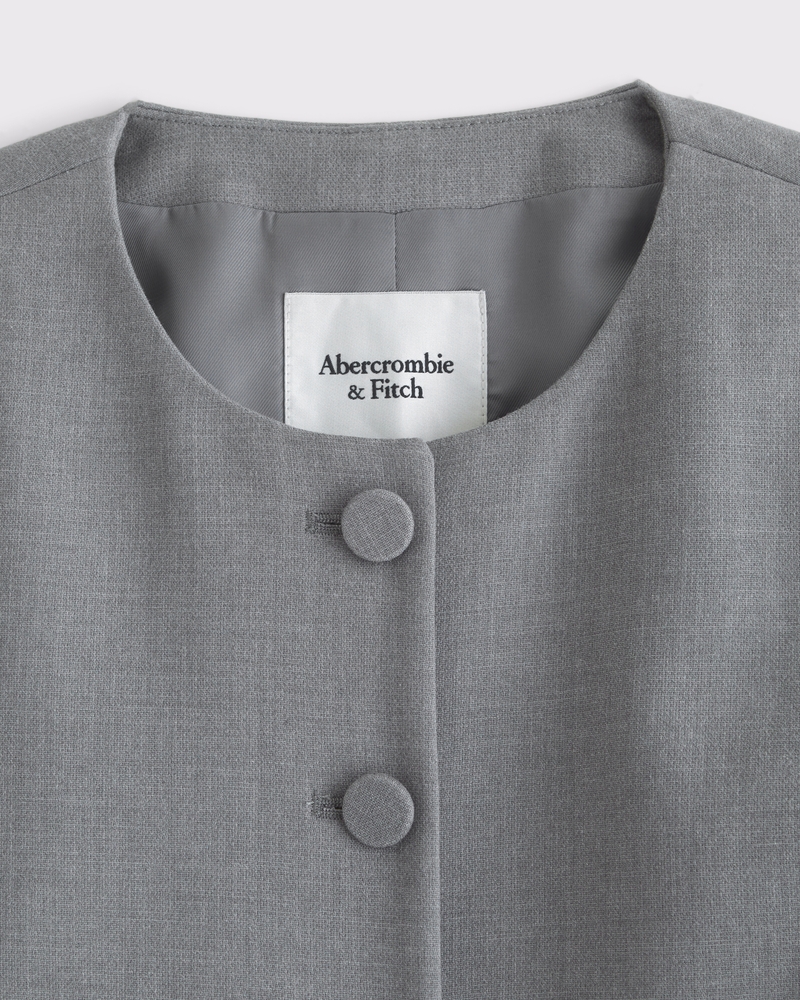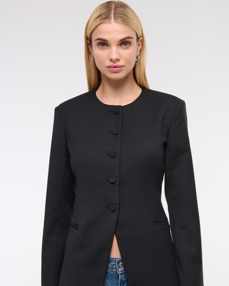 Our new collarless blazer in our suiting fabric, featuring a crew neckline, button front closure and front pockets. The shell of this garment contains 66% recycled polyester. Imported.