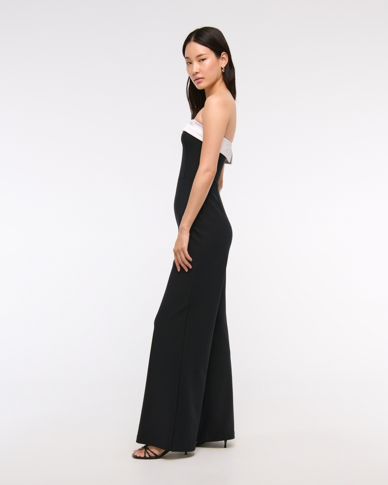 Flattering strapless jumpsuit in our stretch-enhanced crepe fabric, featuring a sculpting satin fabric band and corset-style seaming details along the bodice.