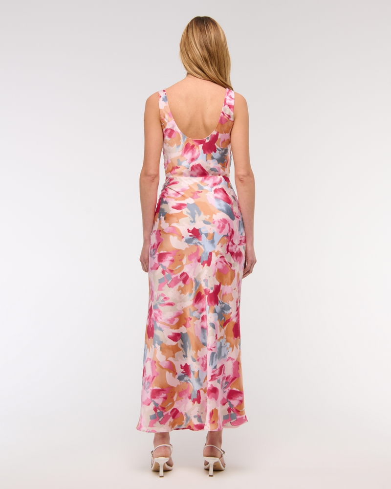 Flattering maxi dress in our textured satin fabric, featuring a cowl neckline, draping details across the bodice and a thigh-high slit detail. Imported.