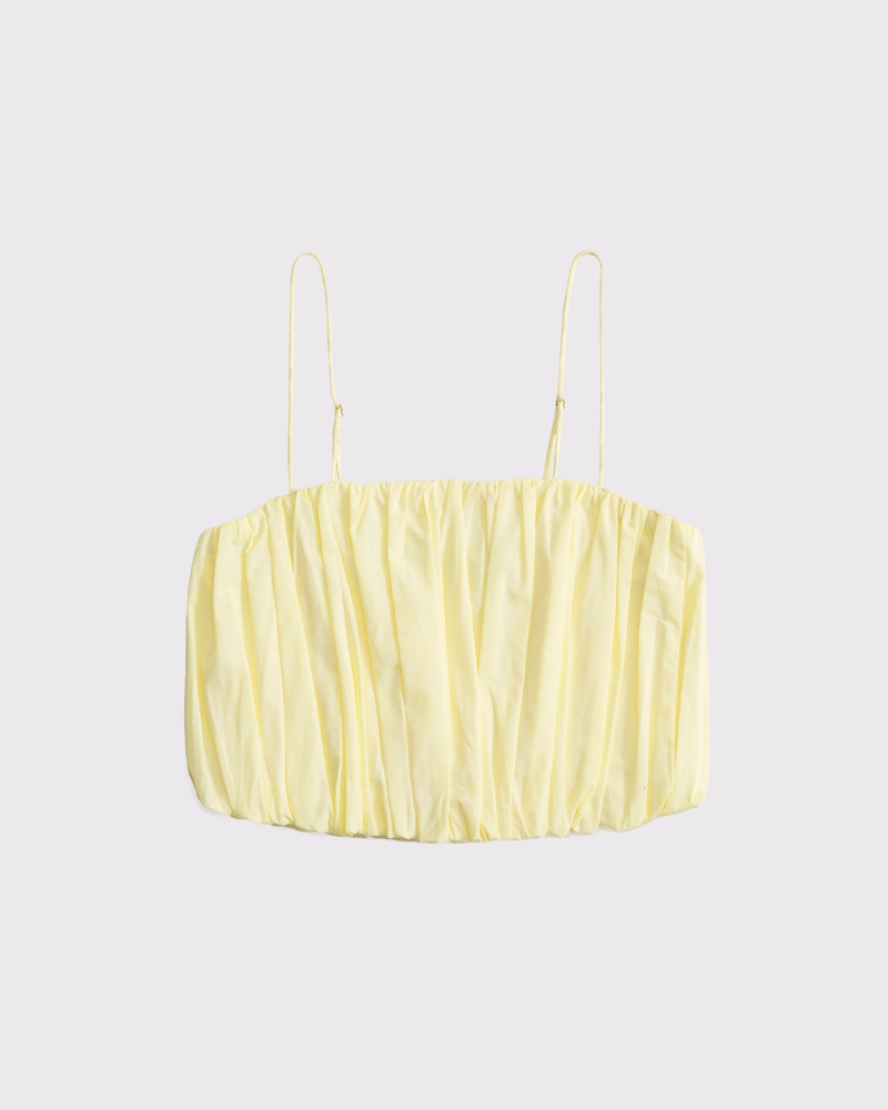 Flattering cami top in a soft poplin fabric and cropped length, with ruching details along the bodice, adjustable straps and on-trend bubble hem. Imported.