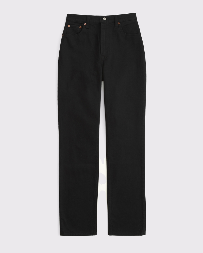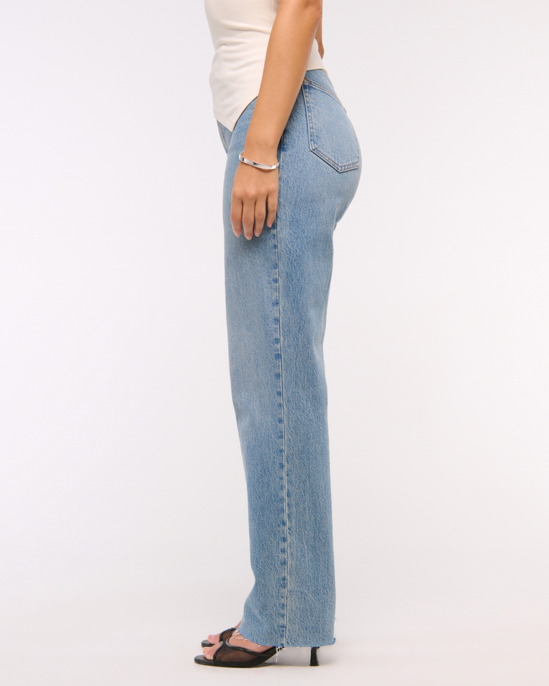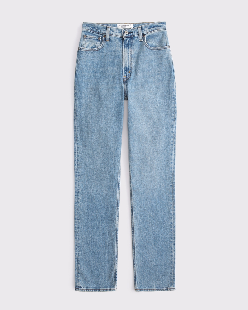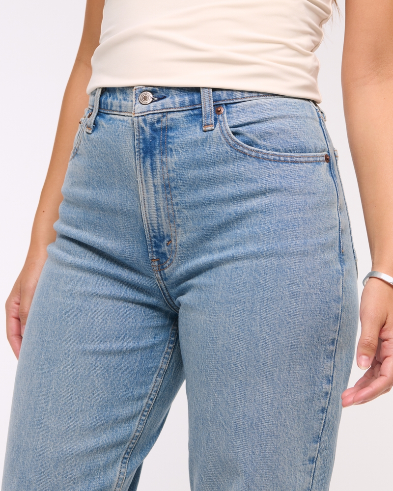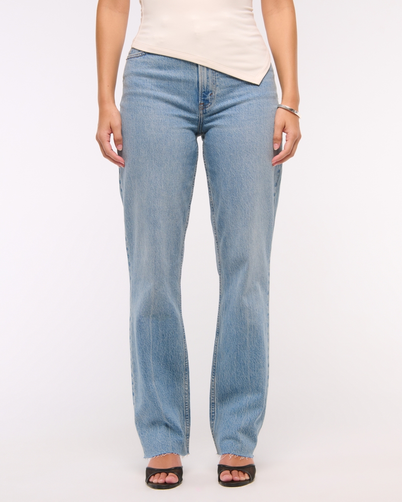 Our Curve Love 90s straight jeans in a medium wash with a raw hem. This fit features an 11.5” ultra high rise, is fitted at top of body and eases through the thigh into a straight leg shape with a full-length inseam. This jean is made from our vintage stretch fabric which features both an authentic vintage look and contains slight built-in stretch for additional comfort. Imported.