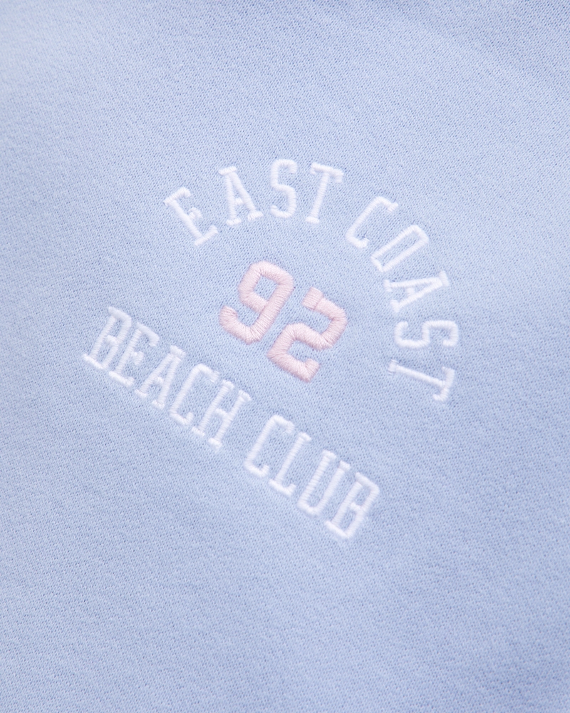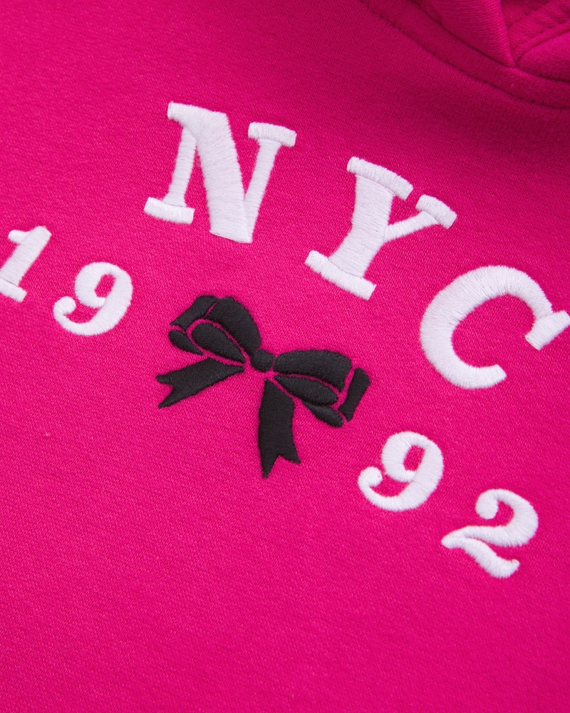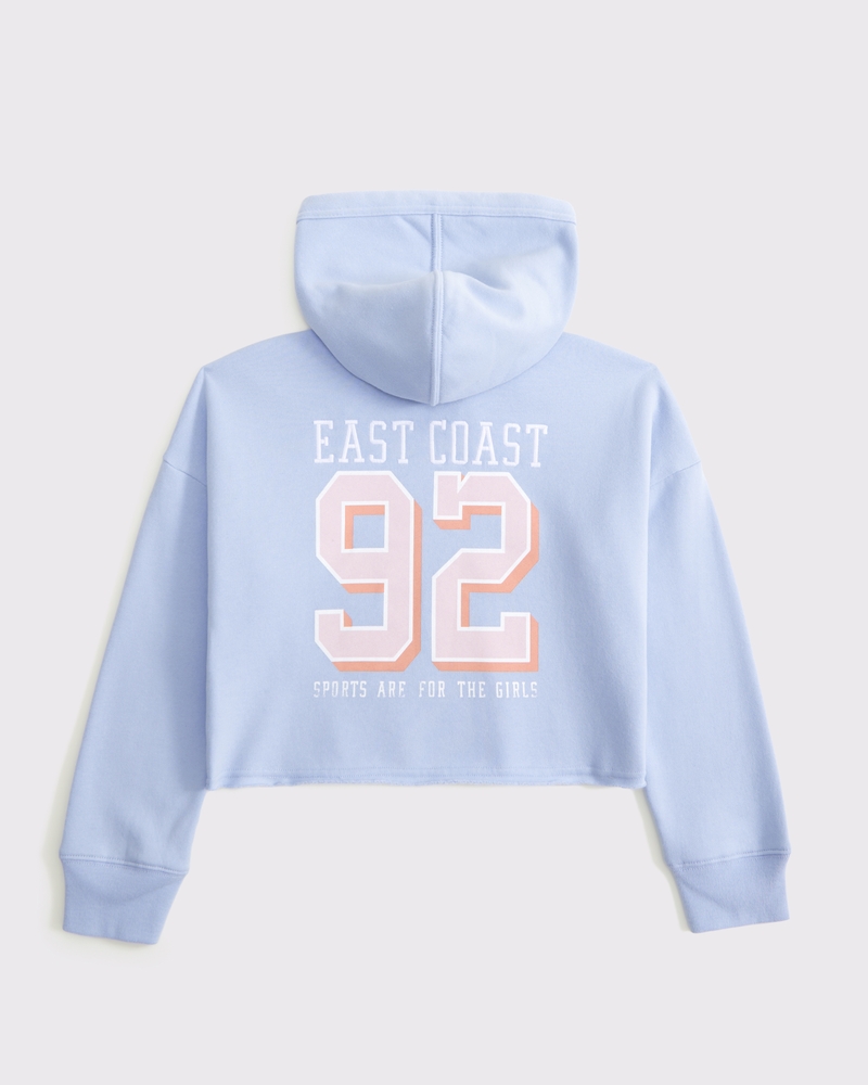 Super comfy popover hoodie in our core fleece fabric and cropped length, with graphic detail at chest and back, on-trend cutoff hem and thumbholes at cuffs. Imported.