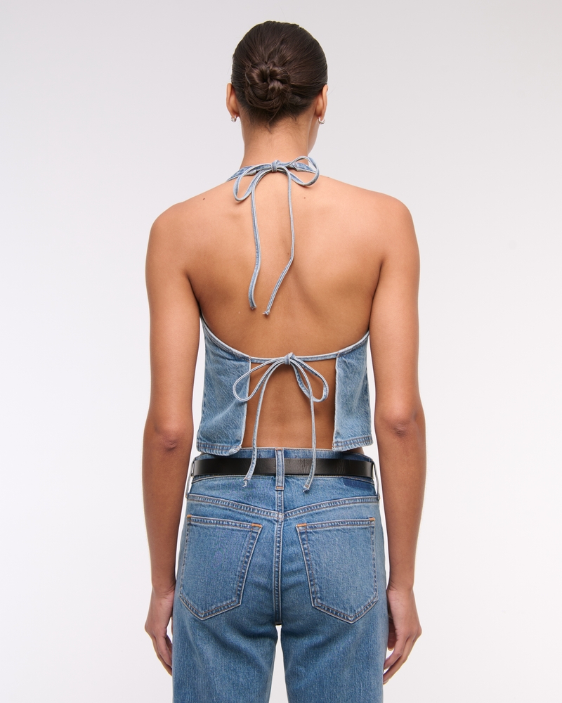 Flattering vest in our comfortable denim fabric and tailored fit, featuring adjustable ties at the halter neckline, on-trend seaming details and tie-back closure. Imported.