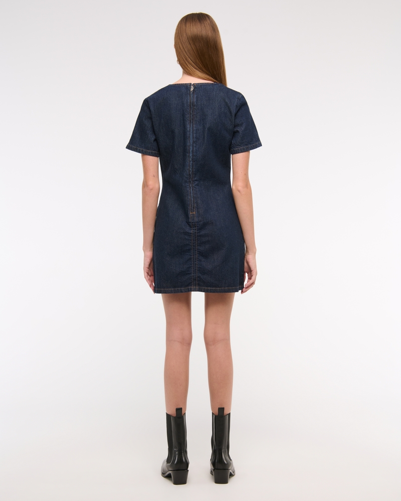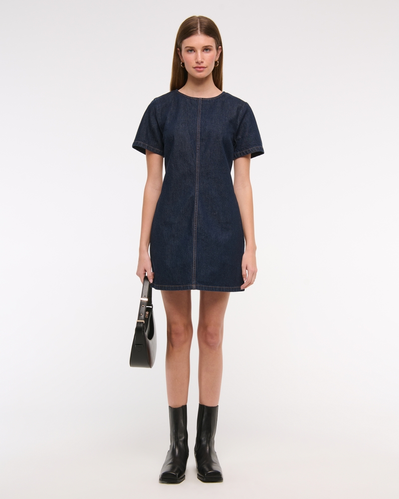 Easy-fitting short-sleeve mini dress in our classic denim fabric and shift silhouette, featuring an on-trend front seam detail and crew neckline. Imported.