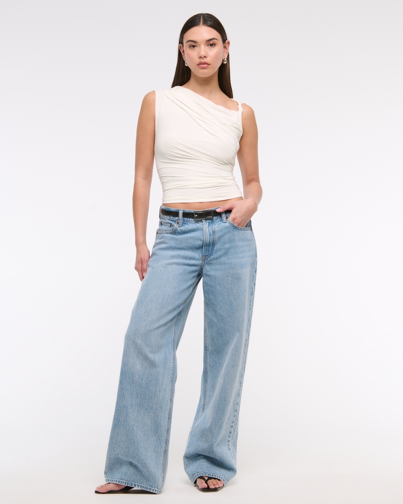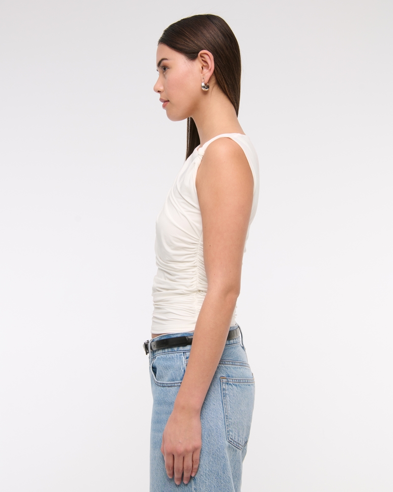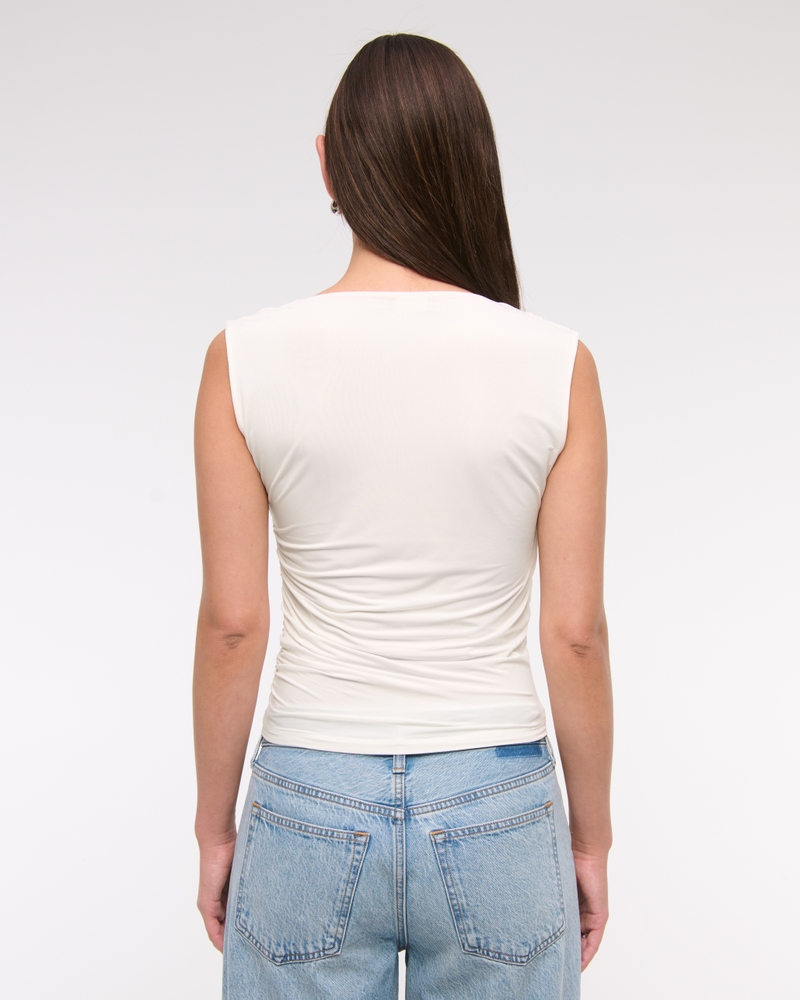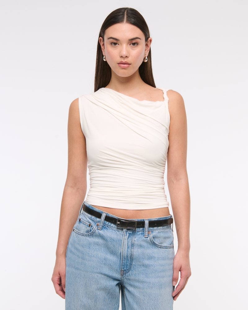 Flattering top in our soft stocking knit fabric and body-skimming silhouette, featuring a cowl neckline, draping details along the bodice and twisted detail on the shoulders. Imported.