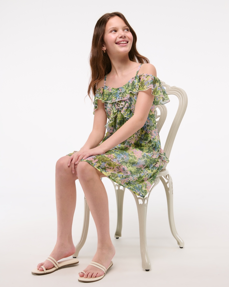 On-trend mini dress in our soft chiffon fabric, featuring all-over ruffle details, off-the-shoulder neckline with flutter sleeves and adjustable straps. Imported.