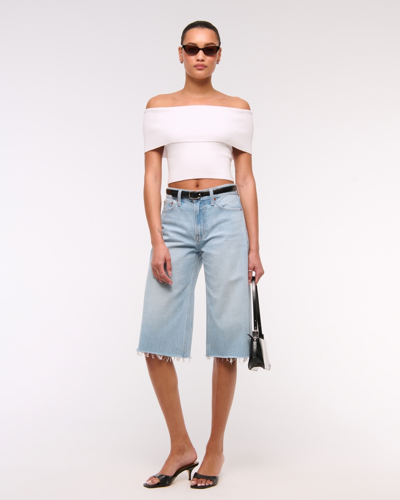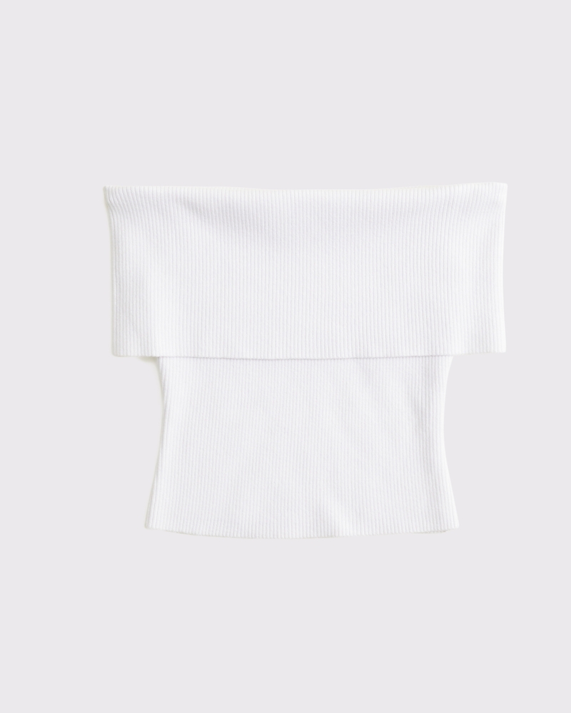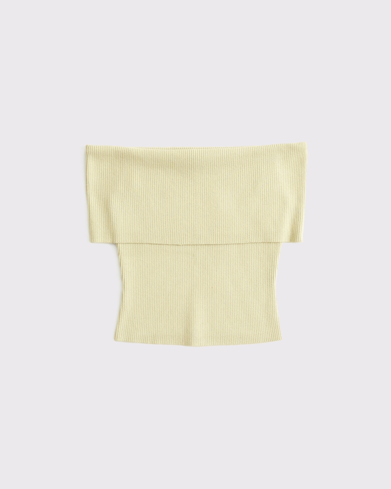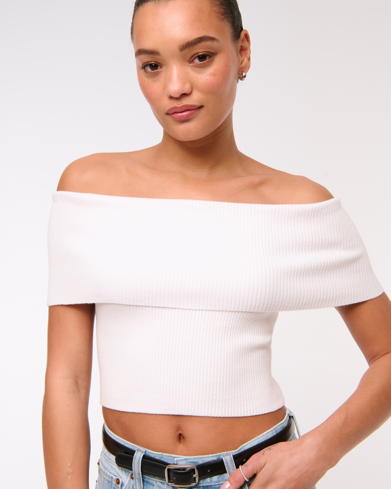 Body-skimming top in our soft sweater yarn fabric, featuring a foldover neckline, off-the-shoulder detail and ribbed stitching details throughout. Pairs perfect with your favorite linen mini skirt! Imported.