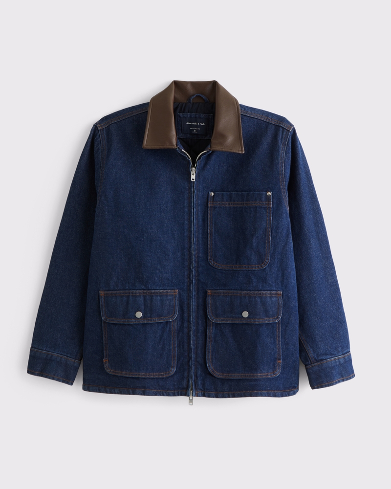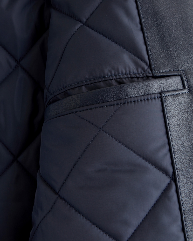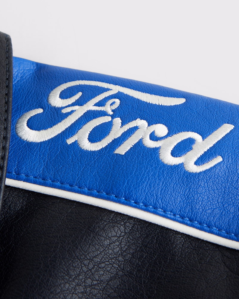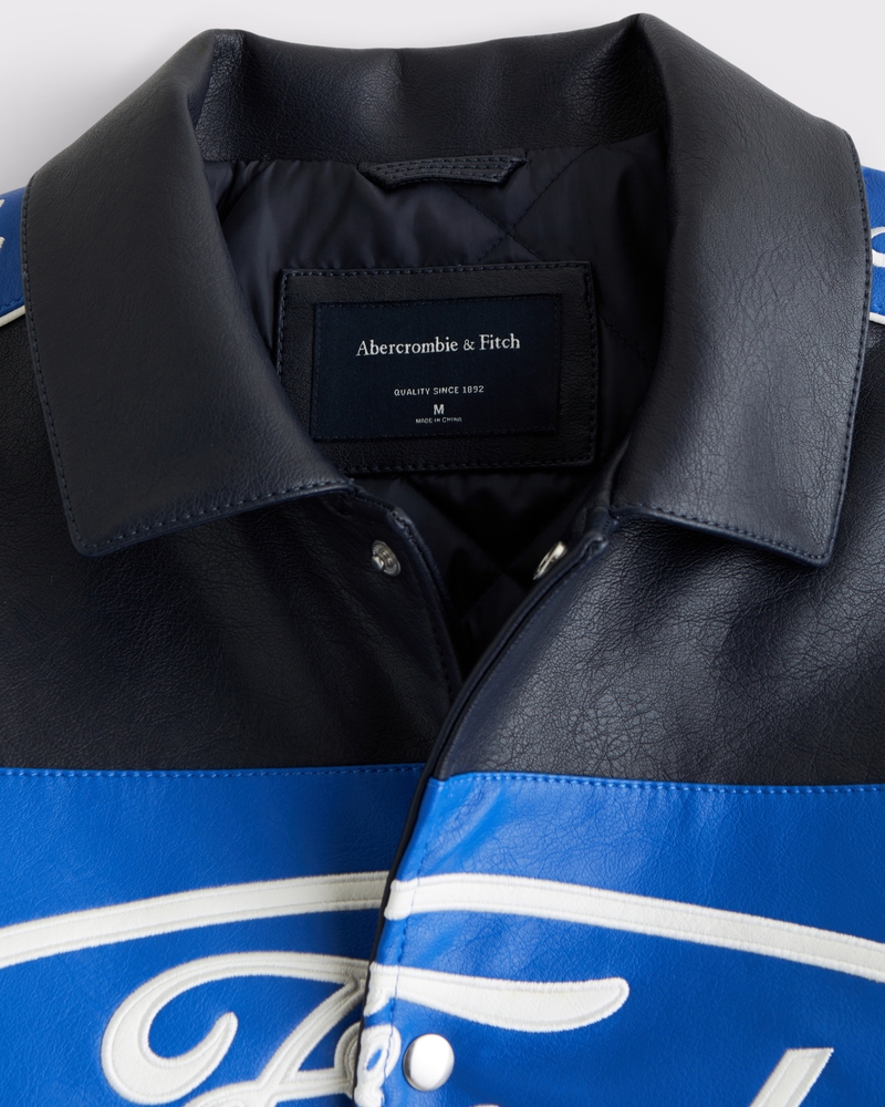 Classic bomber jacket in a soft vegan leather fabric and relaxed-fit silhouette, featuring Ford varsity-inspired embroidered graphic patch details throughout, classic fold-down collar, side pockets, snap-up front and tipping details at elastic cuffs and waistband.