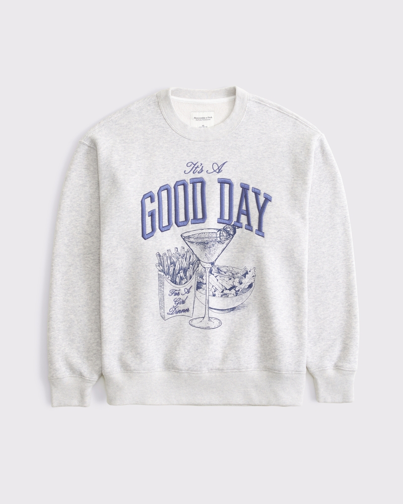 Comfy sweatshirt in our Soft A&F MAX heavyweight fabric and legging-friendly length, featuring a relaxed chest width, Good Day graphic detail at chest, crew neckline and banded hem and cuffs. Imported.