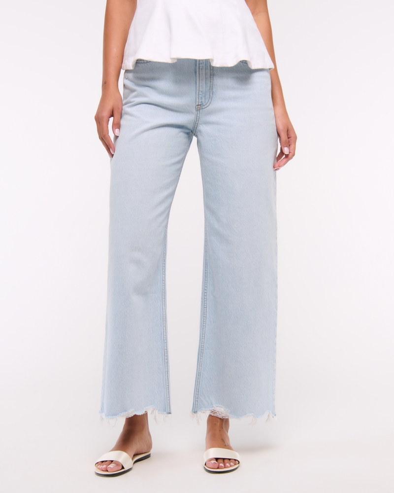 Our classic high rise cropped wide leg jeans in a white wash with a frayed hem. This fit features a 10.5ā high rise, is relaxed at the waist and hips, and eases into a wide, full-length leg shape with a cropped length. This jean is made from our drapey rigid denim fabric, a super soft authentic cotton fabric with no stretch. Imported.