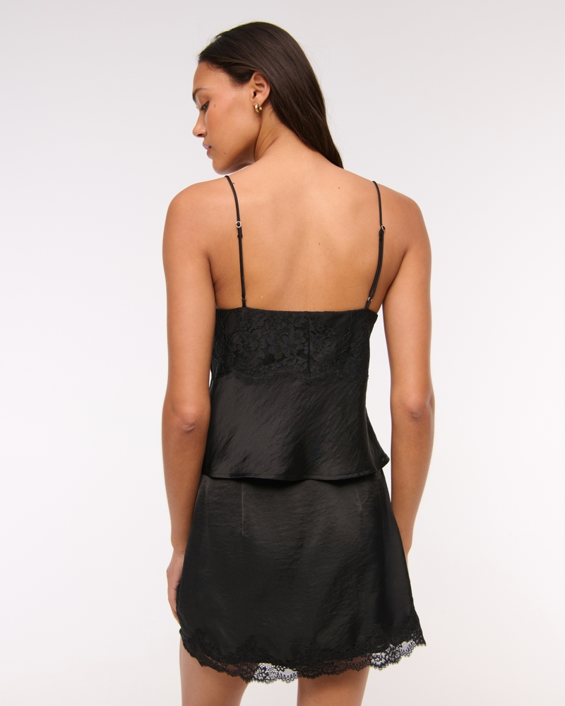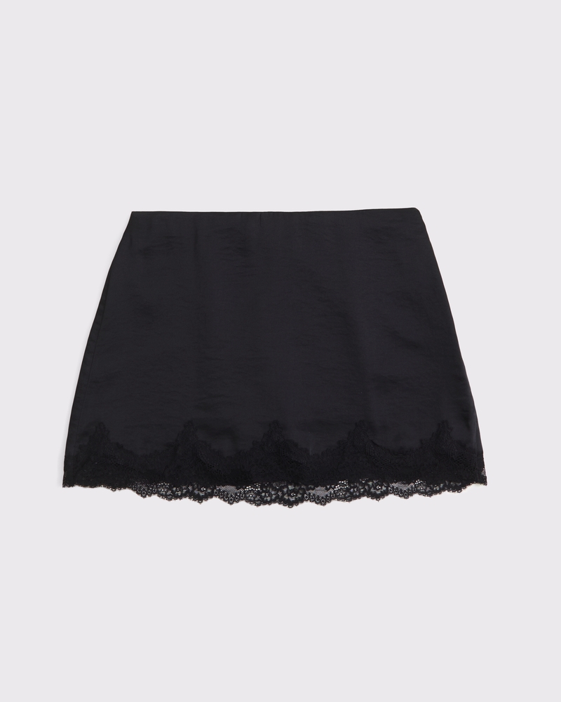 High rise mini skirt in our textured satin fabric, featuring a lace-trim lined hem and side zip closure for a secure fit. Imported.
