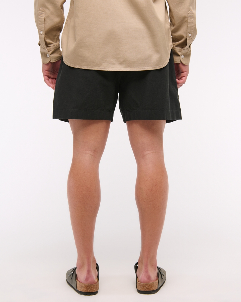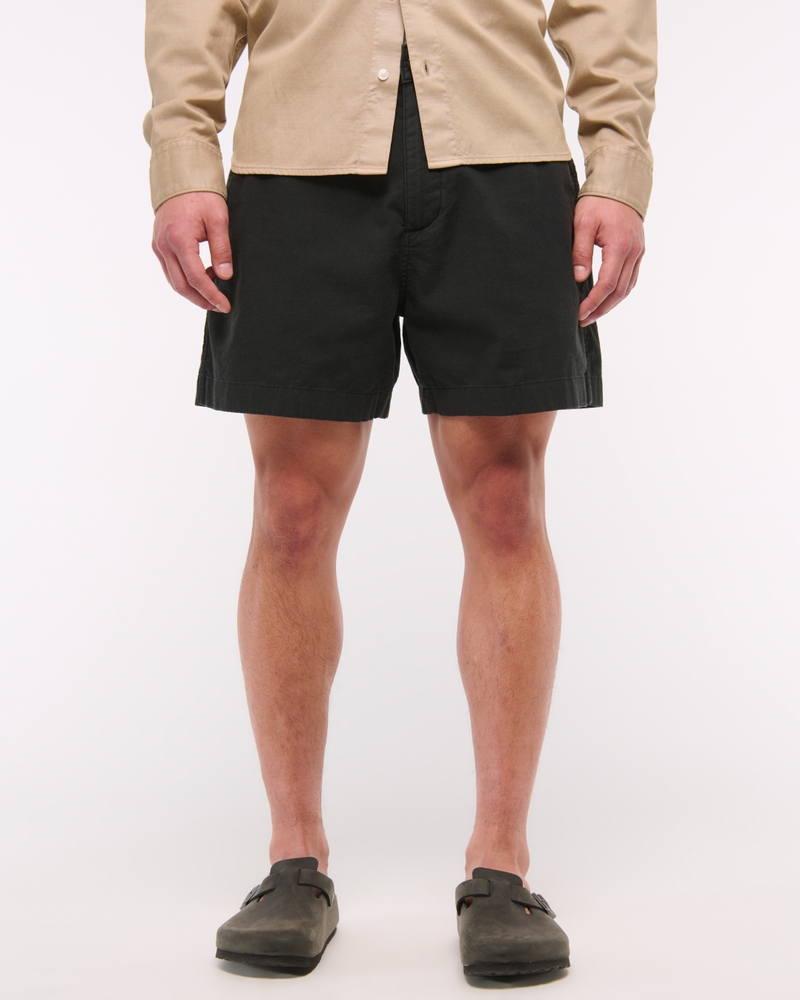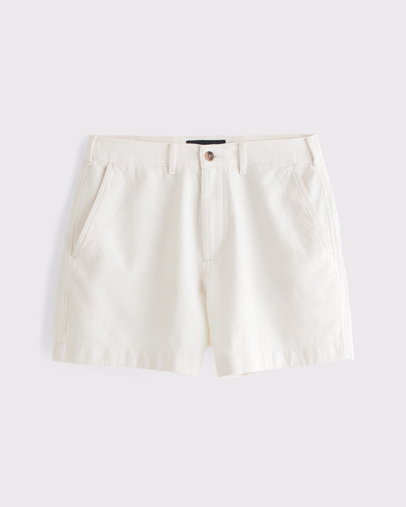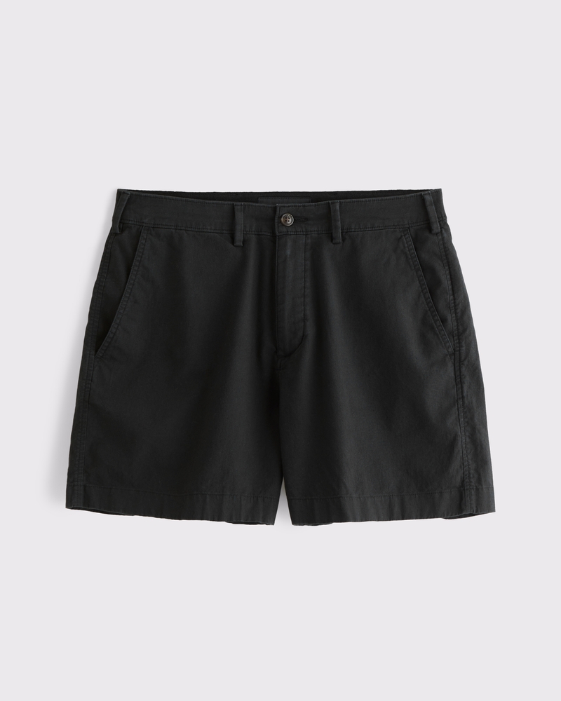 Classic 5 inch (13 cm) plainfront shorts in a textured linen-blend fabric, featuring a soft elastic comfort stretch waistband, pockets throughout with hidden cellphone zip pocket and button and fly closure. Imported.