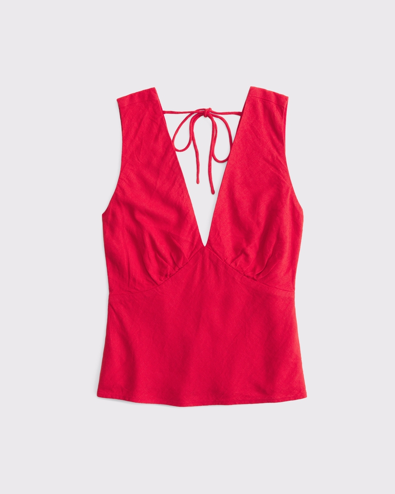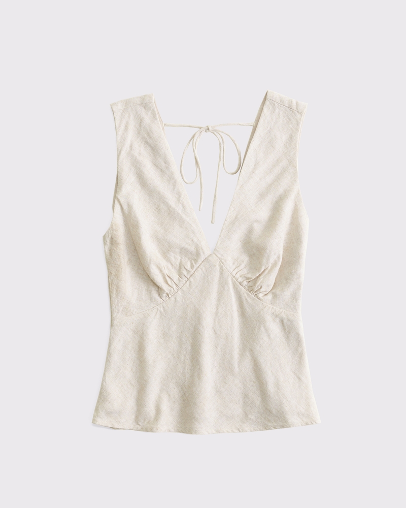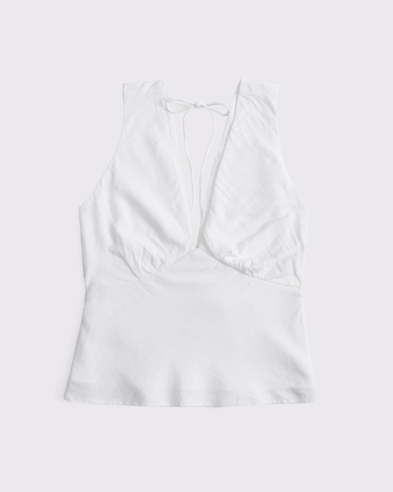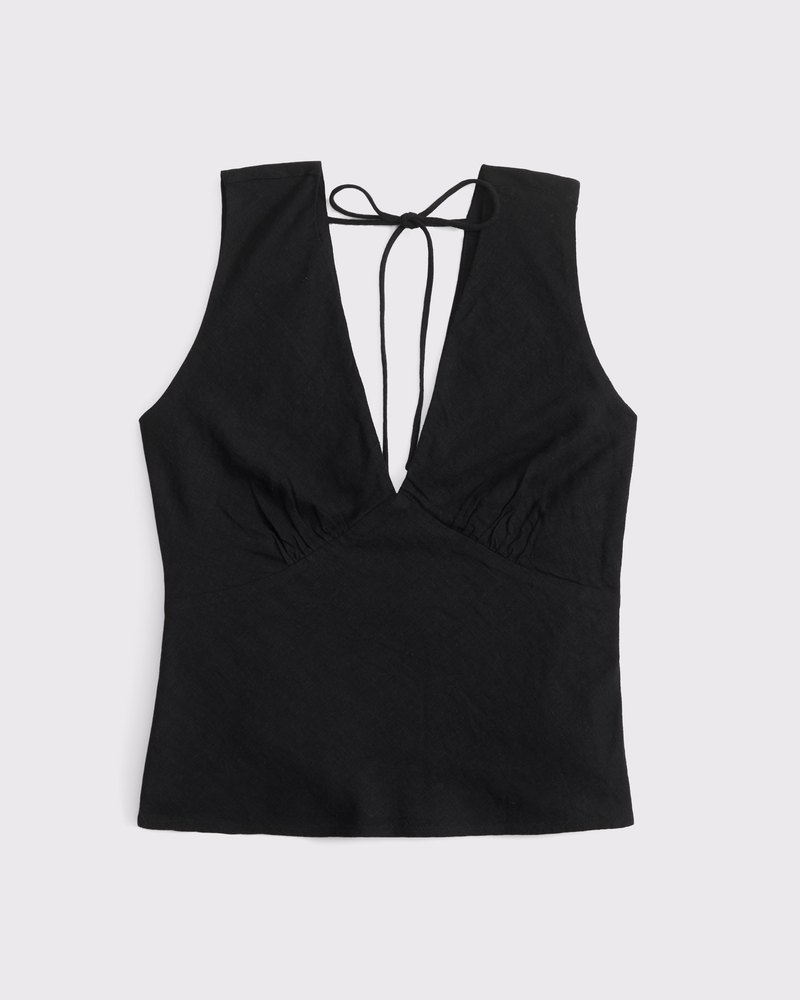 Flattering set top in our soft linen-blend fabric, featuring adjustable tie-back detail and v-neckline. Imported.
