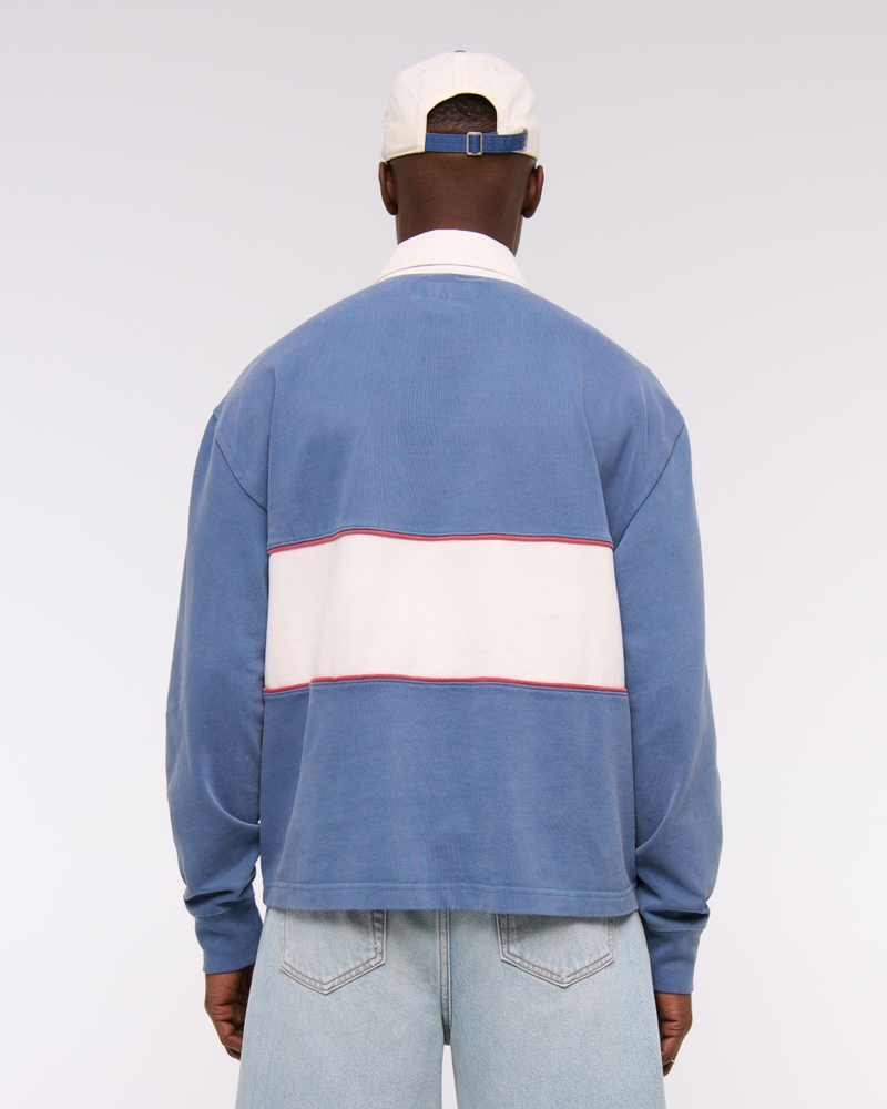 On-trend long-sleeve cropped rugby polo in our new 320g rugby fabric and oversized, drop-shoulder fit, featuring on-trend flag colorblock detail at chest, classic collar and three-button placket. Imported.