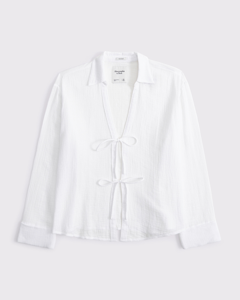 Versatile long-sleeve shirt in a beachy gauzy fabric and oversized-fit silhouette, featuring classic collar, functional tie-front details ands all-over textured detail. Imported.
