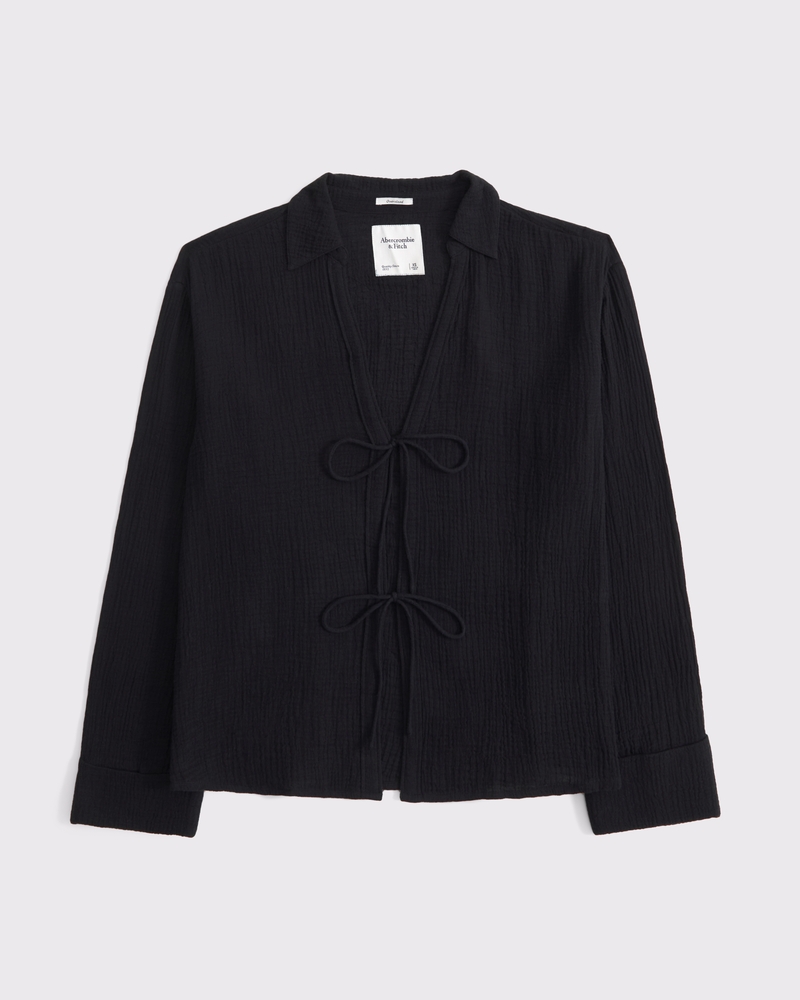 Long-Sleeve Oversized Tie-Front Gauzy Shirt
