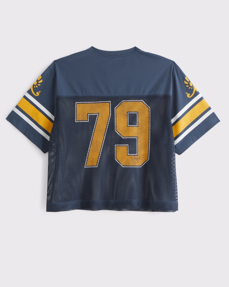 Our new short-sleeve football jersey-inspired tee in a soft mesh fabric, with a more oversized-fit silhouette in width and sleeve length and a subtle cropped length. Features Modelo-inspired graphic detail at chest and v-neckline. Imported.
