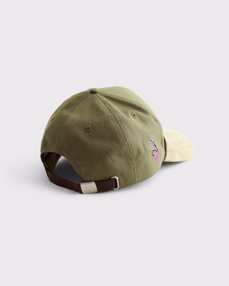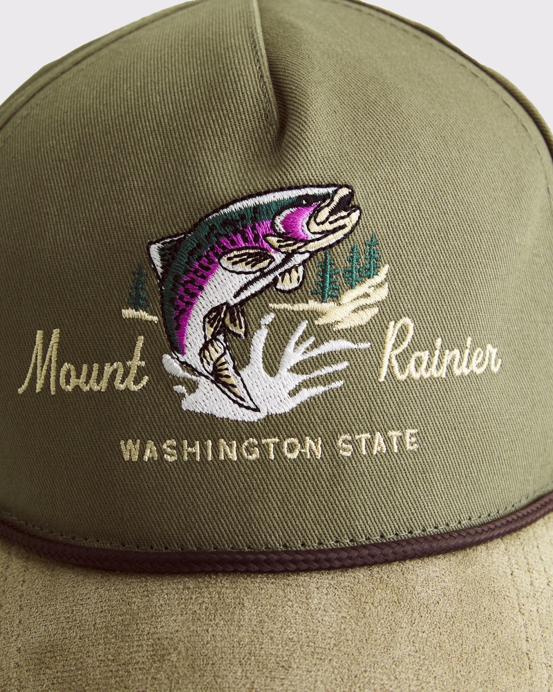 Abercrombie’s baseball hat embroidered with on-trend destination Mount Rainier graphic details, crafted in a cotton-twill fabric, featuring a vegan suede bill and an adjustable rear strap with a metal fastener at back.