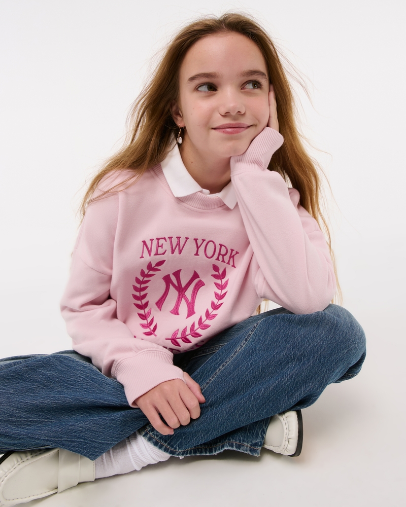 Super comfy sweatshirt in our core fleece fabric, with New York Mets-inspired graphic detail at left chest and back, crew neckline, banded hem and thumbholes at cuffs. Imported.