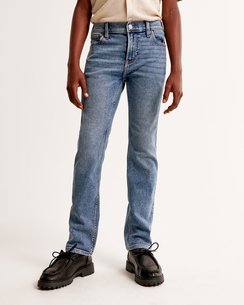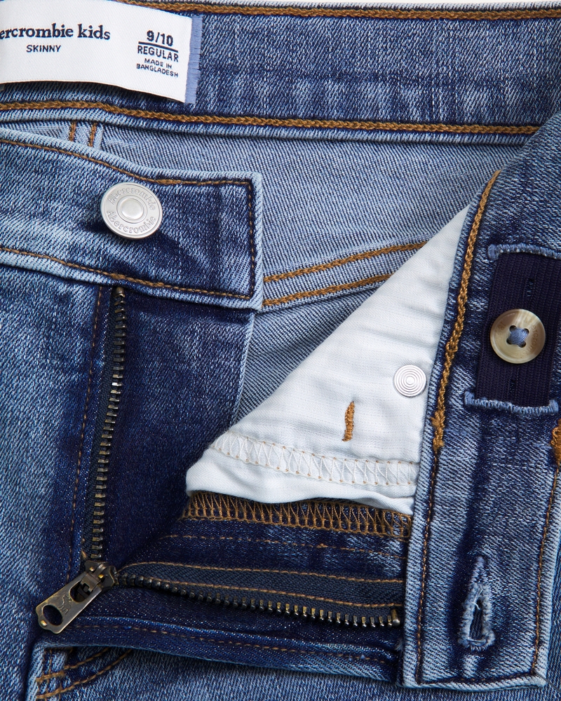 Skinny jeans in ultimate stretch fabric with top-to-bottom slim fit styled with 5-pocket construction and waistband adjusters. Medium wash. Imported.