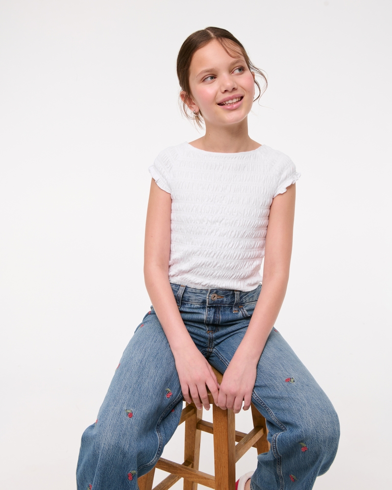 Comfortable short-sleeve tee in our soft jersey fabric, with all-over smocking and off-the-shoulder detail. Imported.