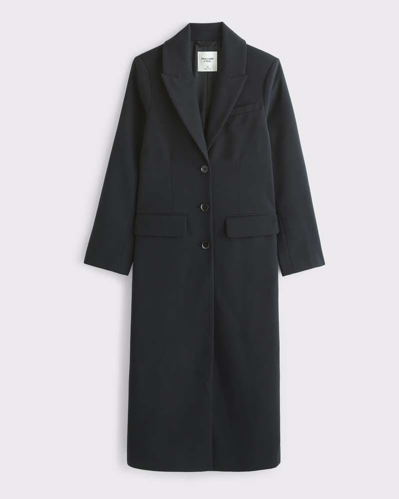 Our new topcoat in a long-length silhouette and made with our recycled suiting fabric, featuring classic blazer details at the collar, side pockets and a button-up front. The shell of this garment contains 66% recycled polyester. Imported.