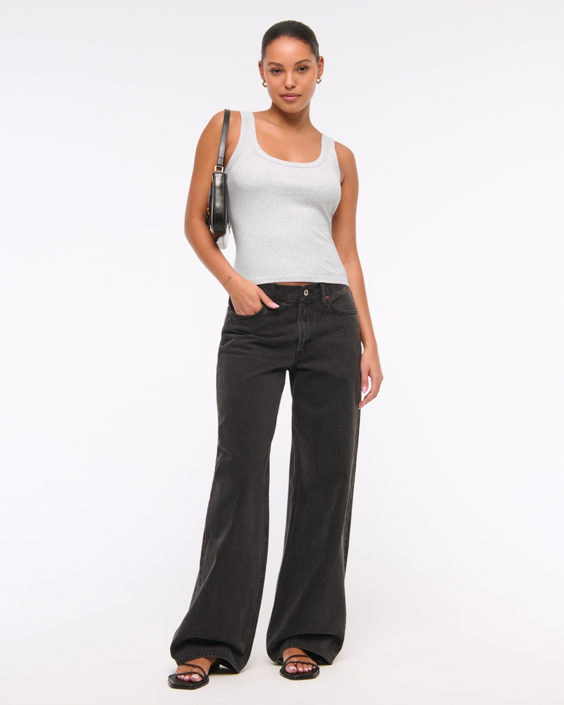 Slim-fitting tank in our vintage rib fabric and tuckable length, featuring flattering 90’s-style scoop neckline and all-over ribbed detail. Imported.